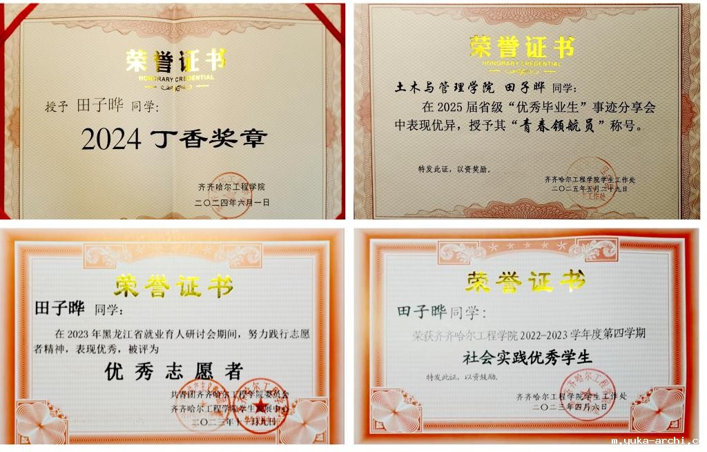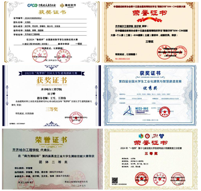 田子晔并不满足于在知识的殿堂中耕耘,在竞赛方面,同样展现出了非凡的实力。他积极参加各类专业竞赛,将所学知识运用到实际操作中,与团队成员密切配合,攻克了一个又一个难题。在2024年“鲁班杯”全国高校数字孪生创新应用大赛中,面对复杂的赛题和强大的竞争对手,田子晔凭借扎实的专业基础和冷静的应变能力,提出了创新性的解决方案。比赛过程中,团队遇到技术难题,他带领团队成员不分日夜反复修改、制作,经过努力,最终斩获国家一等奖。在校期间,田子晔获得建筑元宇宙极限任务挑战赛国家级二等奖、全国数字建筑创新应用大赛国家级三等奖、“筑梦杯”全国大学生建筑创新大赛国家级三等奖、第七届“建模大师杯”全国建筑信息模型(BIM)建模大赛优秀奖、第四届全国大学生工业化建筑与智慧建造竞赛优秀奖、“南方测绘”第四届黑龙江省大学生测绘技能大赛省级二等奖、第十七届全国大学生结构设计竞赛黑龙江分区赛省级三等奖等荣誉。在创新创业方面,他积极参与各类创新创业大赛,凭借扎实的专业知识和创新思维,取得国家级奖项4项,省级奖项3项。