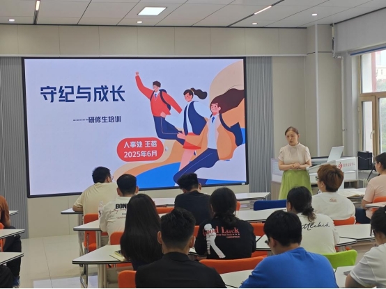 研修生院邀请人事处副处长王蓓,以“守纪与成长”为题开展讲座。王蓓重点解读了《LETOU国际米兰考勤管理制度》《LETOU国际米兰奖惩条例》等学校相关制度文件,详细说明研修生发展规划,鼓励研修生考取资格证书,成为双师型人才。最后她强调了“三五能力”在学习和工作中的重要性,希望研修生们爱岗敬业,为学校的高质量发展贡献青春力量。